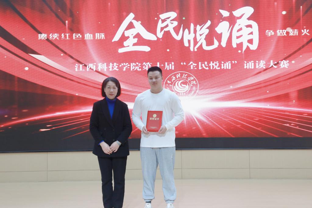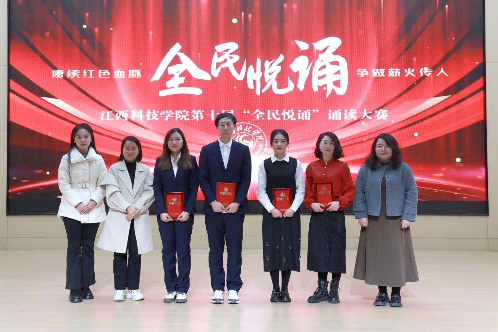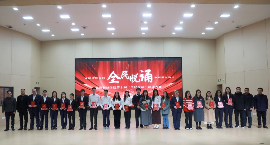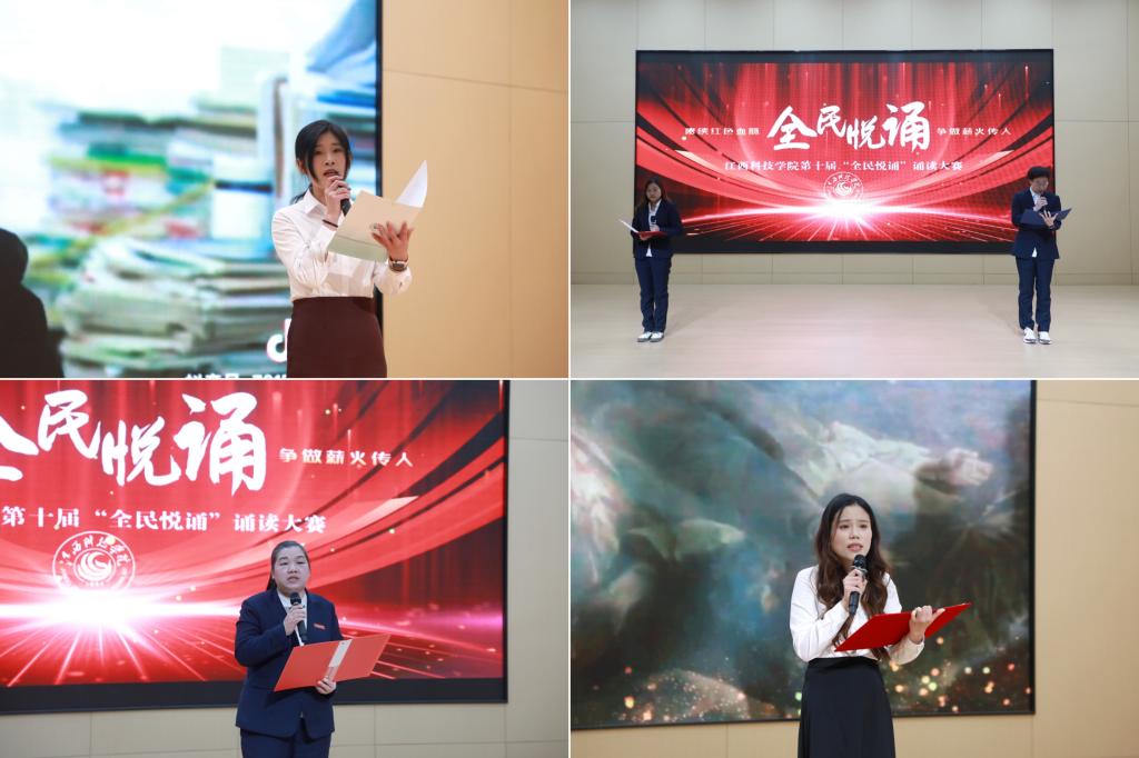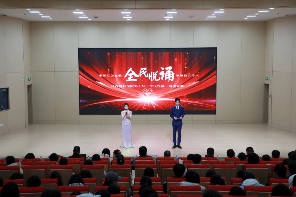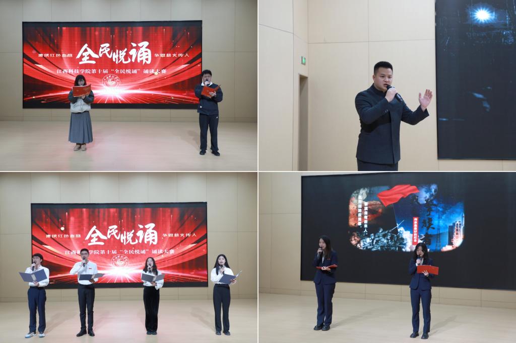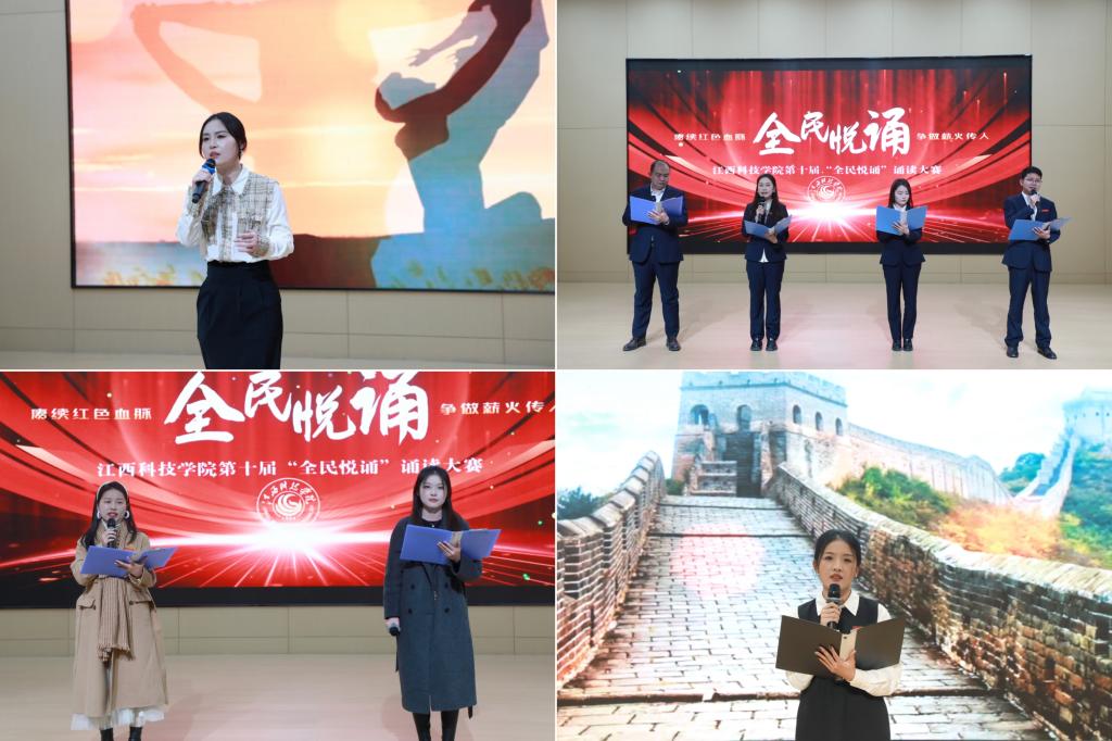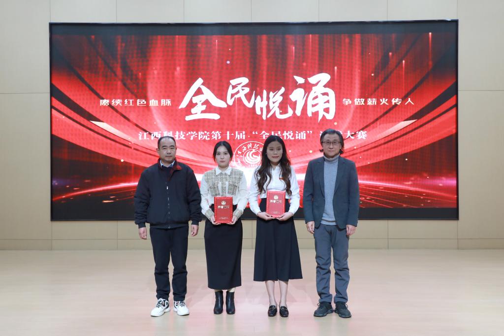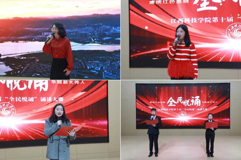 江科网讯(记者 何强江)12月26日下午,由校党委宣传部、工会联合主办的“赓续红色血脉争做薪火传人”第十届“全民悦诵”诵读大赛教工组决赛在报告C厅圆满落幕。副校长、工会主席林素君,校党委副书记、副校长闵桂林与师生代表一同到场观看比赛。江西广播电视台播音指导、中国播音学会常任理事、中国诗歌学会会员、江西省播音主持协会副主任委员、国家级播音员主持人上岗资格考试主试评委、国家级普通话水平测试员杨帆,我校宣传部副部长、电视台台长陈凡,音乐舞蹈学院播音与主持教研室主任童玲担任评委。