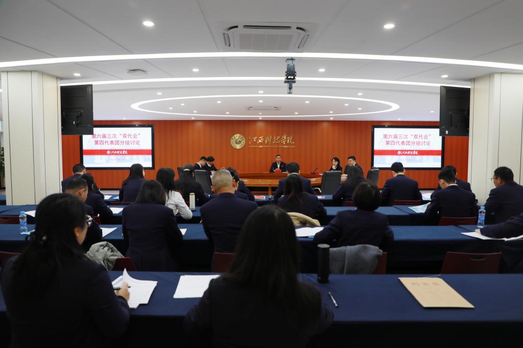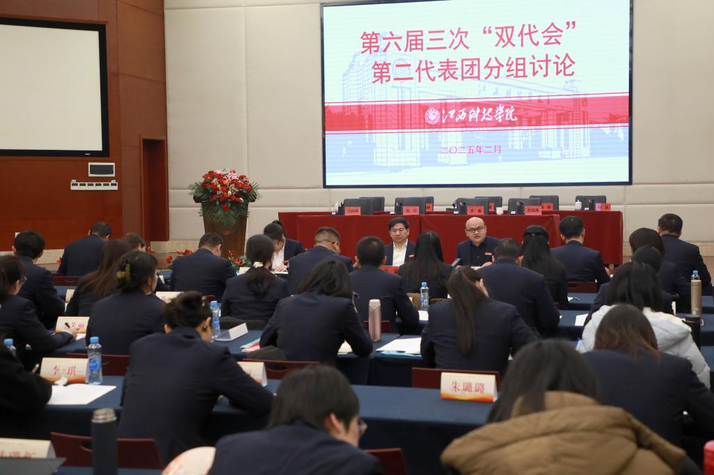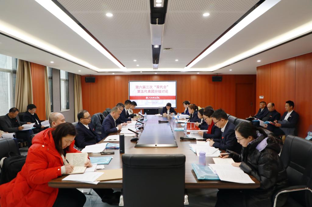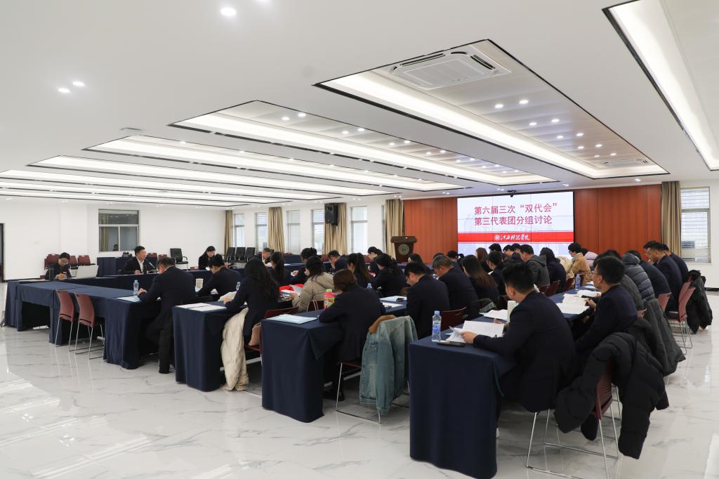 按照会议议程,与会代表分五个代表团进行分团讨论。代表们本着对学校发展事业的高度责任感和使命感,结合工作实际,讨论审议《学校工作报告》《工会工作报告》,对学校的建设发展积极建言献策,并民主评议校级领导。代表们认为,校长工作报告总结回顾了2024年学校各方面取得的突出成绩,研判了学校当前存在的困难不足和面临的发展形势,部署了学校2025年主要工作。报告主题鲜明,重点突出,求真务实,对加快推进学校高质量发展具有十分重要的现实意义和指导意义。校领导分别到所在代表团与代表们共同参加讨论,听取大家的意见和建议。