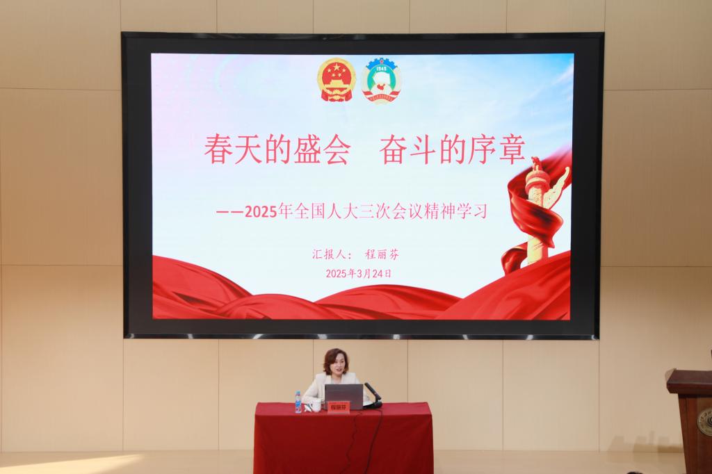会上,程丽芬教授以《春天的盛会奋斗的序章》为题,从大会概况、大会主要精神、江西代表团主要活动和履职情况等方面,结合参会经历和履职体会,全方位、多角度、系统性地传达了全国两会精神,重点传达了两会期间习近平总书记重要讲话精神,政府工作报告,全国人大常委会工作报告,最高人民法院工作报告,最高人民检察院工作报告等主要内容。其讲解对引导广大师生深刻认识全国两会重大意义,全面准确把握习近平总书记重要讲话精神、全国两会精神的核心要义和思想精髓具有指导意义。“会议虽已结束,但使命仍在肩头。”她表示,在未来的日子里,将继续秉持对人民负责、受人民监督的初心,不断提升履职能力和水平。