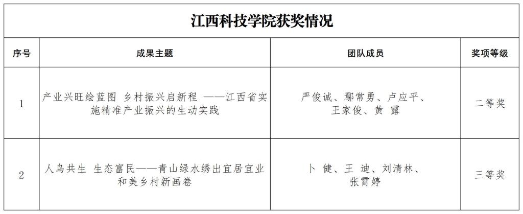 严俊诚老师团队的成果《产业兴旺绘蓝图乡村振兴启新程——江西省实施精准产业振兴的生动实践》获二等奖。该成果以婺源县石门村、靖安县古楠村、安义县西路村三个村落的产业发展模式作为典型案例,通过分析江西省实施精准产业振兴的途径,探讨产业发展与乡村振兴之间的内在逻辑。