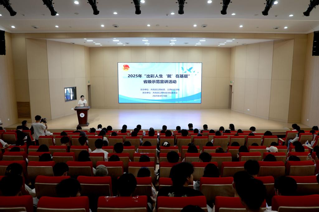 江科网讯(记者 何强江)4月10日下午,由共青团江西省委、江西科技学院主办,共青团江西科技学院委员会承办的2025年“出彩人生‘就’在基层”省级示范宣讲活动在报告C厅。团省委领导出席,校党委副书记、副校长闵桂林致辞。我校及江西师范大学、南昌工程学院、江西外语外贸职业学院、江西制造职业技术学院、江西现代职业技术学院、江西工业职业技术学院等高校团委相关负责同志,与近300名青年学子参加本次活动。