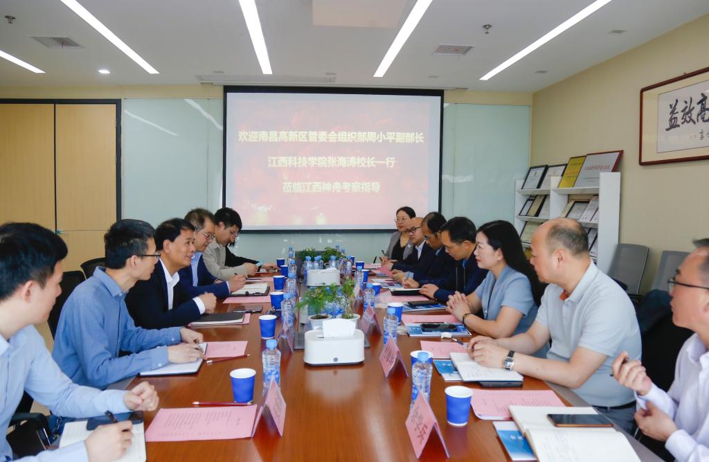 会前,张海涛校长一行参观了江西神舟核心业务区,详细了解公司发展历程、研发成果等。