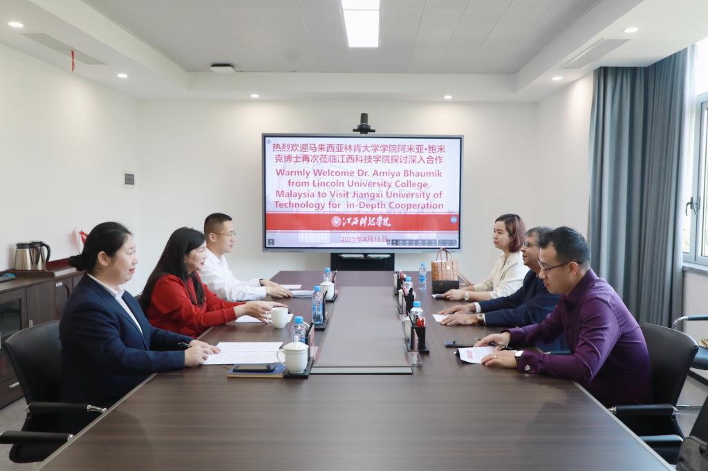 江科网讯(通讯员 曹穗蓉)4月15日,马来西亚林肯大学学院校长AmiyaBhaumik一行应邀访问我校,就深化教育合作进行交流。校长张海涛出席座谈会,副校长吕文威主持座谈会。林肯大学学院中国区官方代表张宜朔、李杨井尉,我校人事处负责人及相关工作人员参会。
