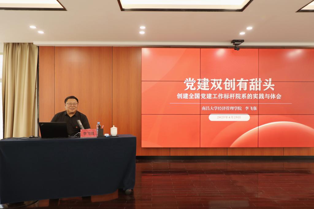 报告中,李飞强从深刻领会习近平总书记关于高校党的建设工作的重要论述切入,阐述了新时代基层组织建设与创新的相关内容。他分享了南昌大学经济管理学院创建全国党建工作标杆院系的工作经验,着重讲解了学院以 “三项行动” 凝心聚力、“三个平台” 固本支撑、“三大工程” 创新驱动的 “三三三” 党建工作法。最后,他指出,做好高校党建 “双创” 工作,需党政同心、师生参与、上下协同,组建材料专班,强化宣传工作,保障资源供给。做好党建工作,要充分发挥校领导的领导核心作用、二级党组织的政治核心作用、支部的战斗堡垒作用、党员的先锋模范作用;要切实增强党建的引领、推动、支撑、内驱、保障作用。