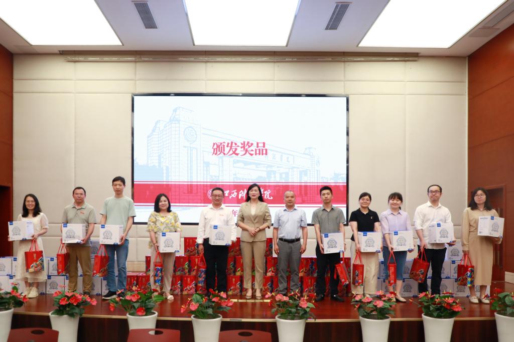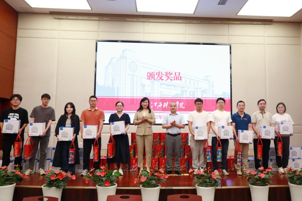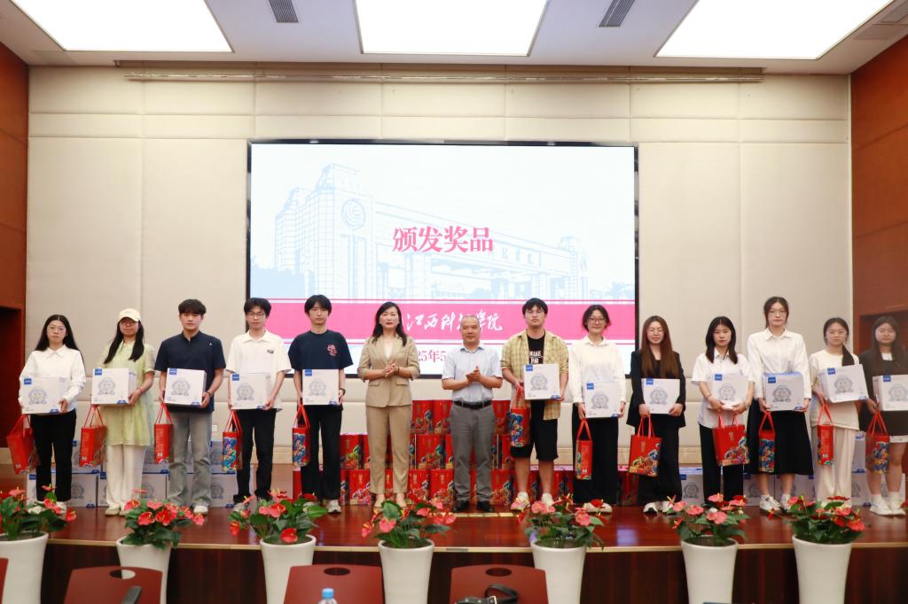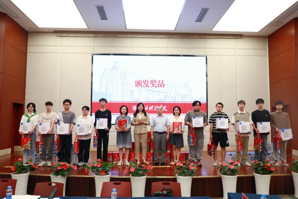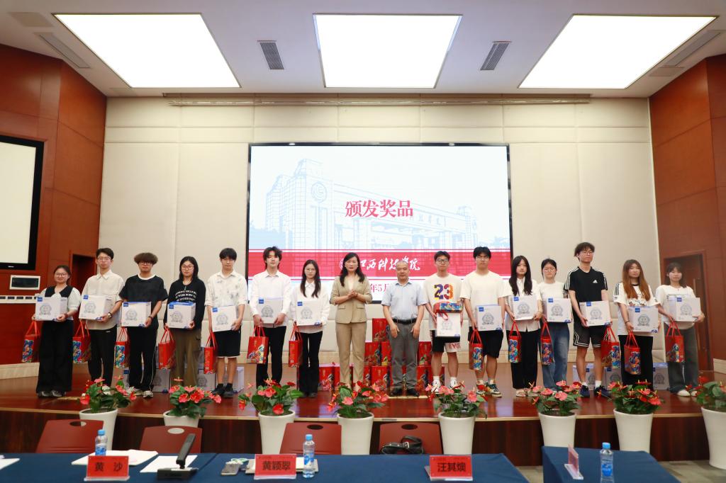 会上,张海涛校长、闵桂林副校长一同为师生代表颁发奖品。