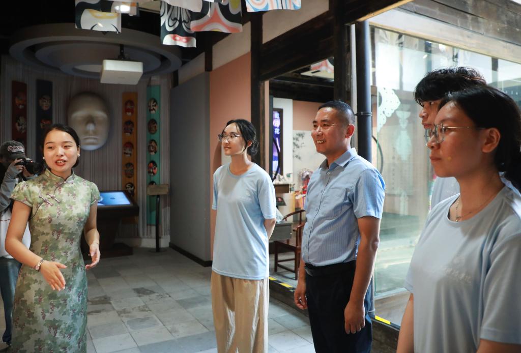 在东方戏圣汤显祖的故乡——抚州文昌里历史文化街区,江延湖书记与“临川四梦up团”的师生共同探寻中华优秀传统文化在戏曲声腔中的薪火相传。在中国戏曲博物馆,讲解员带领师生们了解了中国戏曲萌芽、形成、成熟、繁荣、嬗变、革新的历史脉络,学习了戏曲文学、戏台人物、表演功法、艺术语言、戏曲演员的四项基本功等戏曲知识,欣赏了千变万化的舞台妆容、描龙绣凤的戏曲服饰、包罗万象的舞台布景,美轮美奂的戏台建筑、风格各异的戏曲音乐。