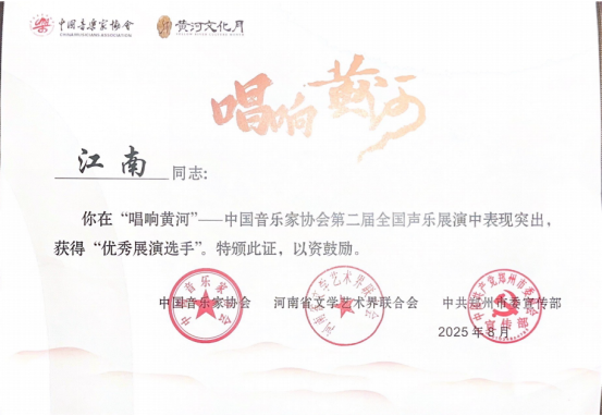江科网讯(来源 音乐舞蹈学院)近日,2025年中国(郑州)黄河文化月暨“唱响黄河”中国音乐家协会第二届全国声乐展演在郑州大剧院落下帷幕。展演中,我校音乐舞蹈学院教师江南凭借深厚的艺术造诣,以恢宏气势展现了黄河精神,斩获“优秀展演选手”称号。