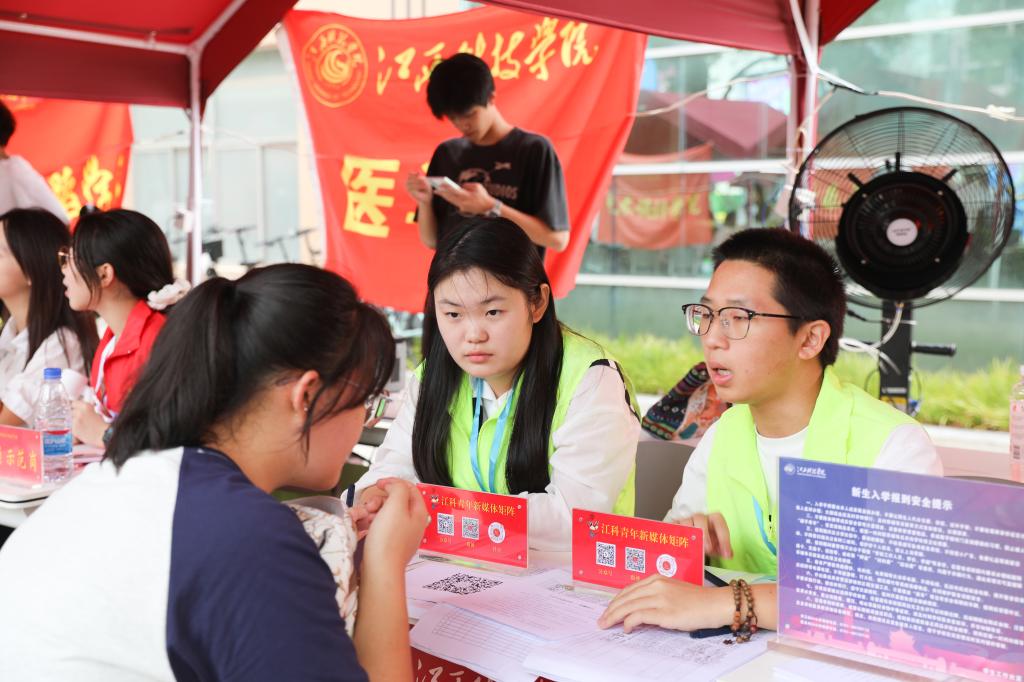 初秋的江科校园,彩旗飘扬,满目盛景,每一处布置都饱含着学校对新生的期盼与祝福。大学生服务中心集中报到点,数十顶迎新帐篷整齐铺开,迎新志愿者们笑容满面、耐心引导,防暑降温点物品一应俱全,“迎新好望角”游戏区热闹非凡,“惊喜盲盒”打卡点色彩缤纷……在这充满活力与希望的场景中,新同学们带着憧憬与向往,自此踏上属于自己的大学新旅程。