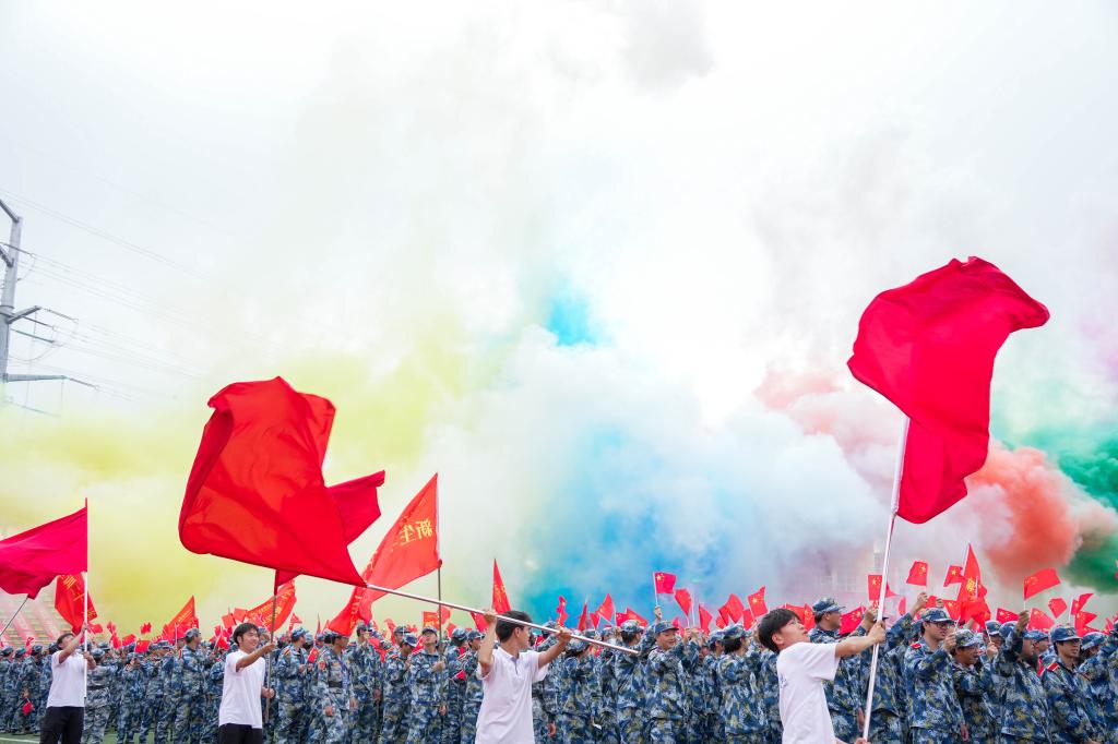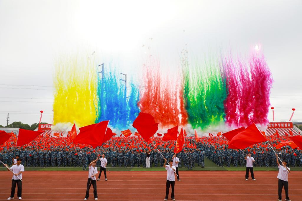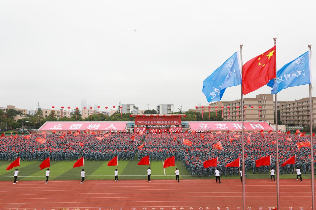 “五星红旗迎风飘扬,胜利歌声多么响亮,歌唱我们亲爱的祖国,从今走向繁荣富强……”当《歌唱祖国》的旋律响起,师生挥舞着国旗,同唱一首歌,整个奥林匹克中心仿佛化作一片红色的海洋,将典礼的氛围推向高潮。嘹亮的歌声回荡在运动场的每个角落,也承载着师生们对祖国的祝福与对未来的期许。这场融合了仪式感与青春力量的盛典落下帷幕,而2025级新生的大学旅程,正带着军训的收获、学校的嘱托以及对祖国的赤诚,以昂扬姿态正式启航。