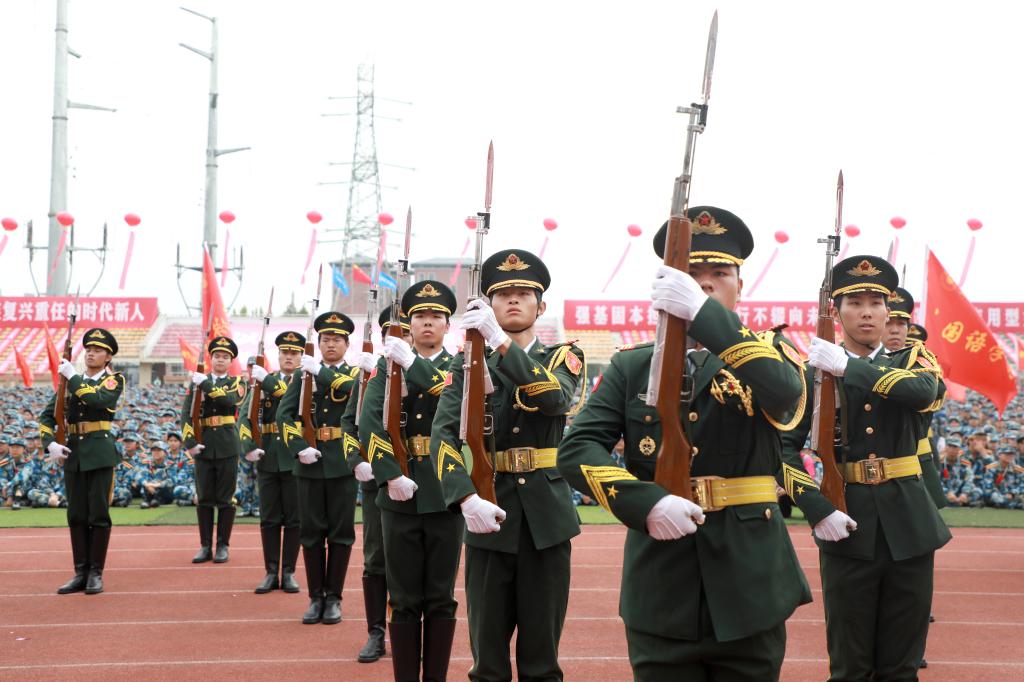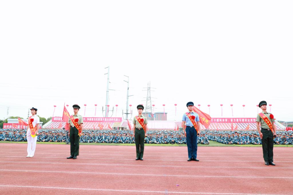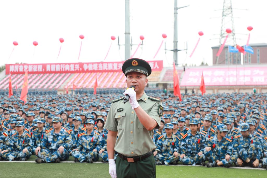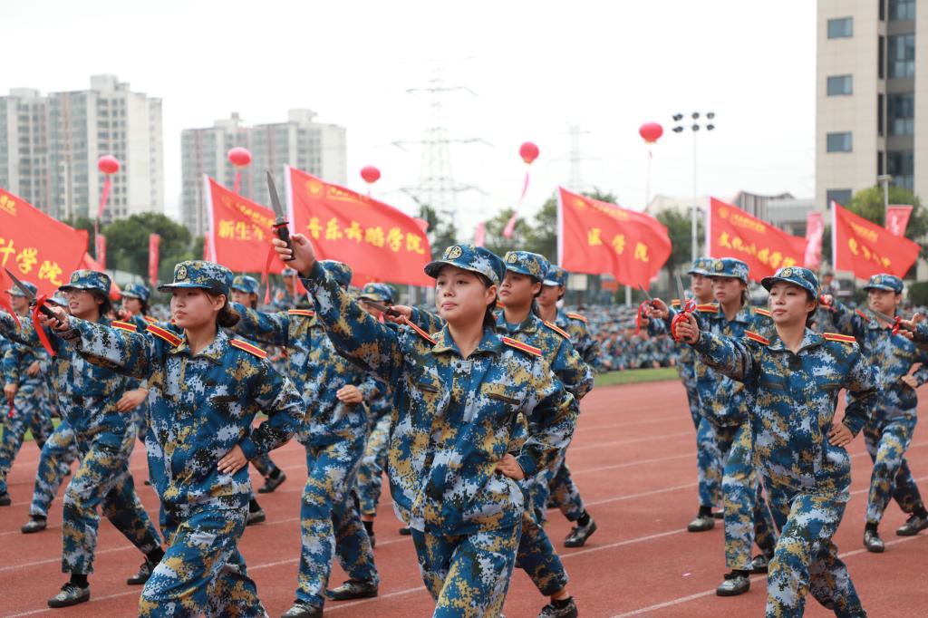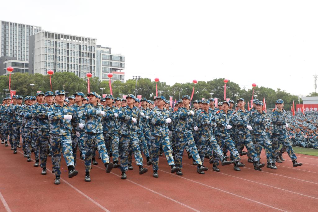 8时08分,礼炮齐鸣,现场全体师生肃立面向冉冉升起的五星红旗,高声齐唱国歌。升国旗仪式毕,2025级新生军训连队分列式正式开始。伴随着《分列式进行曲》,各新生代表方阵队依次迈着铿锵步伐通过主席台,摆臂如波浪整齐,落脚似惊雷震撼。他们眼神坚定如炬,脸庞虽带着青涩,却已透着军人般的刚毅,向学校和老师交出了最动人的成长答卷。分列式后,《芳华绝代,迷彩群英》《国旗下的荣耀》等军训成果汇报接续上演,一招一式刚劲有力,尽显新生们的蜕变与锋芒。