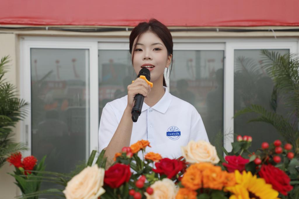 在热烈的掌声中,退役军人学生代表身着军装,以标准军礼向学校报到。他们昂首挺胸、神情坚毅,不仅诠释着“退伍不褪色”的担当,更为全体新生树立责任与坚守的榜样,让“奉献”二字在校园中愈发清晰可感。博雅国际学院张一涵同学作为新生代表发言,号召全体新生在江科这片沃土上,踏实扎根,勇敢绽放,努力成长为有理想、敢担当、能吃苦、肯奋斗的时代新人。