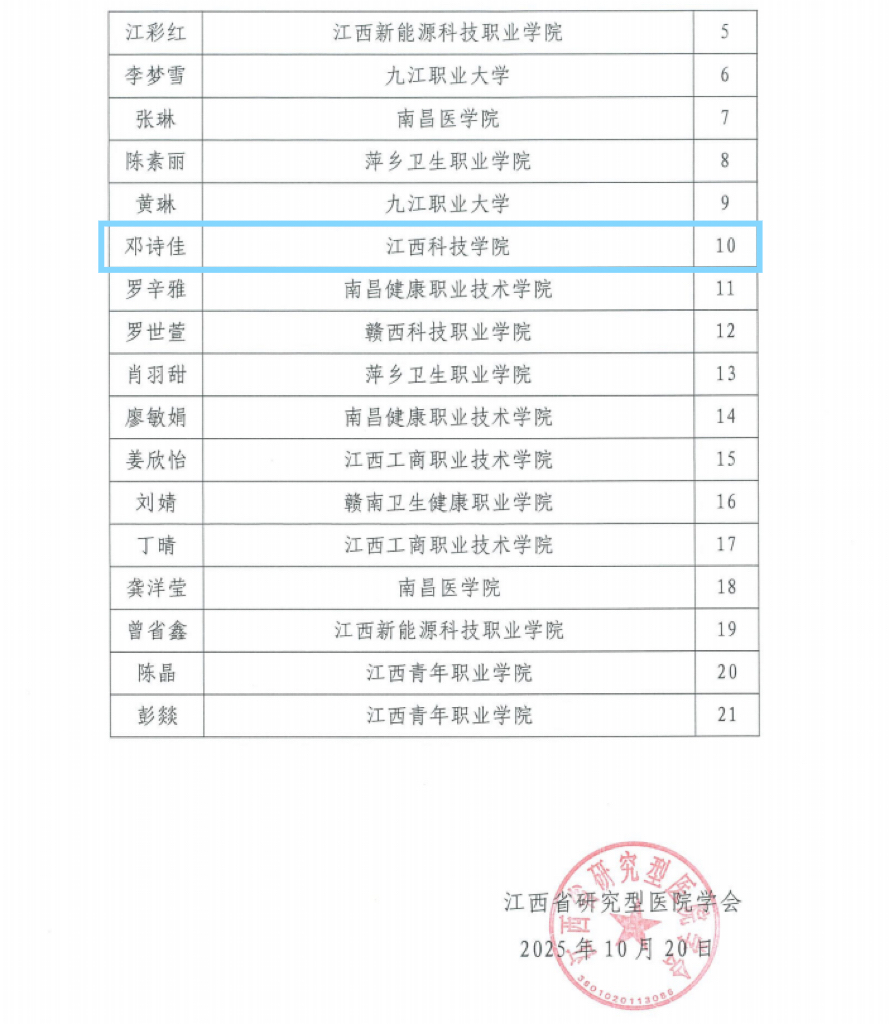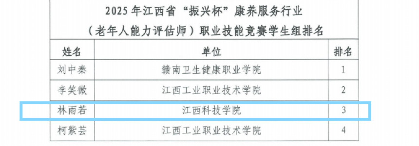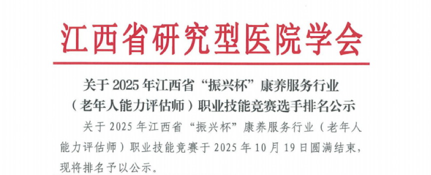 江科网讯(通讯员 孙广瑞)近日,由江西省研究型医院学会举办的2025年江西省“振兴杯”康养服务行业(老年人能力评估师)职业技能大赛圆满落幕。本次大赛中,我校医学院学子林雨若、邓诗佳凭借扎实的专业知识和优异的现场表现,分别斩获全省第3名、第10名,充分展现了江科学子良好的职业素养和精神风貌。