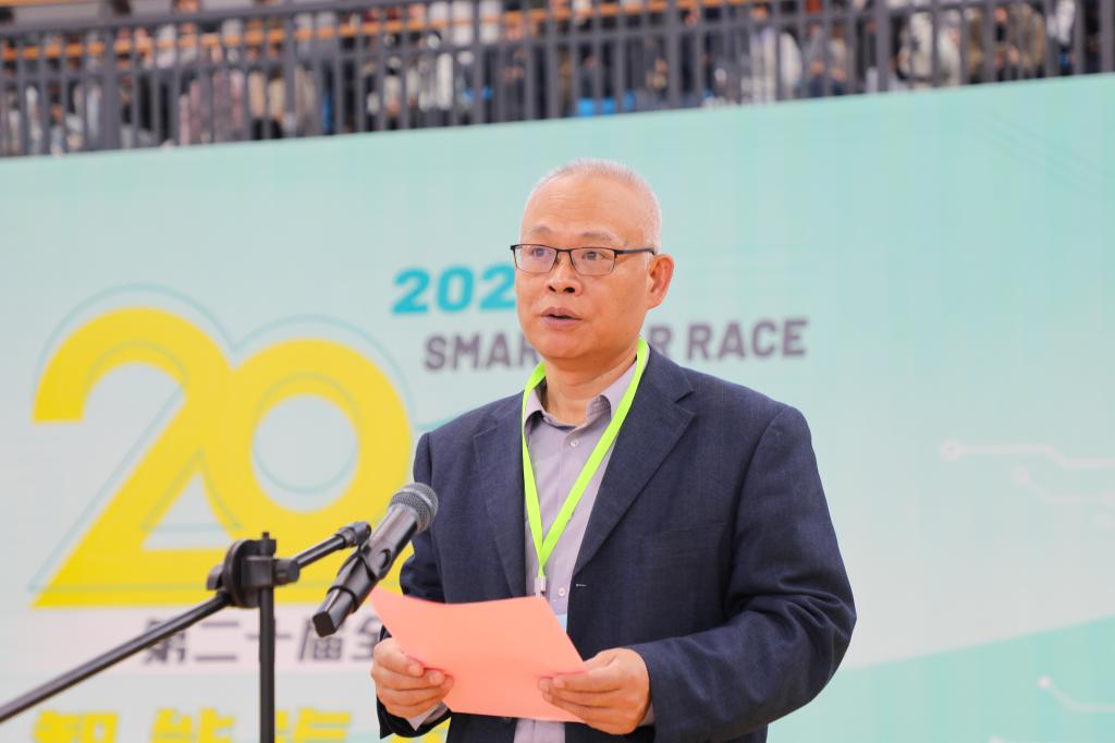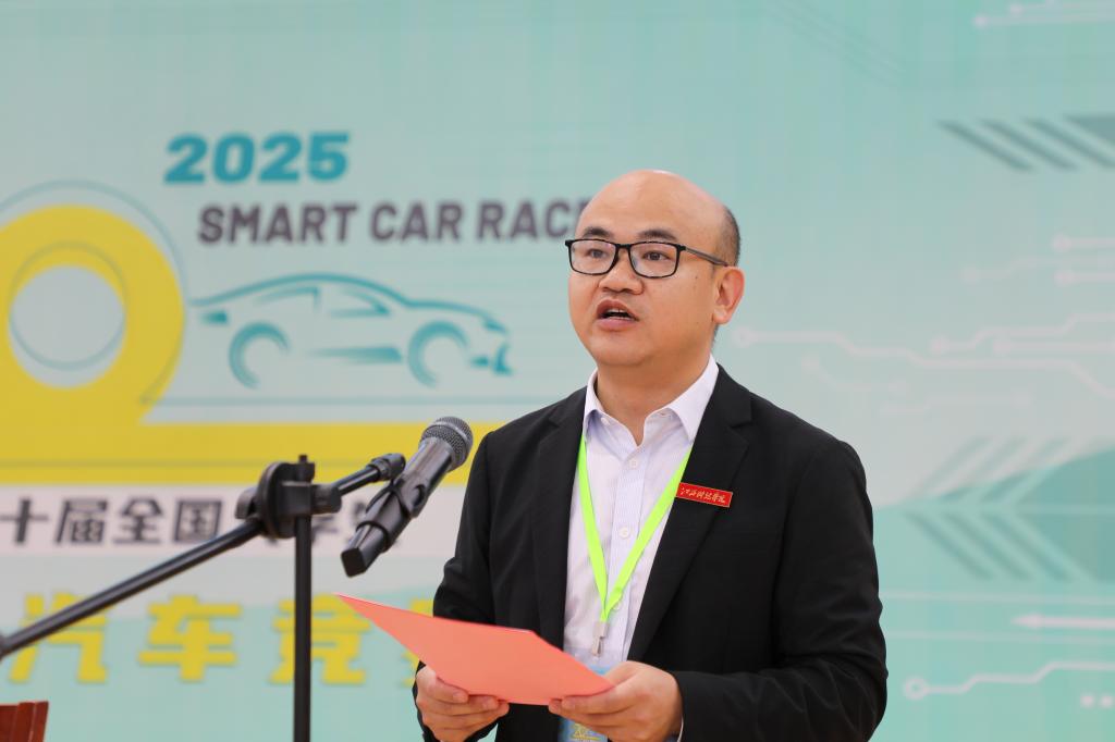 在全场高唱中华人民共和国国歌后,闵桂林代表承办方致辞,对到场嘉宾、评审专家、参赛指导教师以及各位选手的辛苦付出表达感谢。他指出,近年来,江西科技学院面向科技前沿、面向行业需求,着眼现在、布局未来,主动适应新一轮科技革命和产业变革浪潮,积极响应国家战略对人才培养的新需求,深化教育教学改革,积极推进以赛促教、以赛促学。首次承办江西省大学生智能汽车竞赛,学校创办人于果、理事长喻恺、校长张海涛高度重视、亲自部署,并作出明确指示,要求用力做好支持、用心做好策划、用情做好服务,为赛事提供细致周全的保障。他鼓励参赛选手以饱满的热情、昂扬的斗志,在智能汽车的赛道上彰显青春风采,勇攀科技高峰;赛事工作人员坚守岗位、精益求精,全力做好赛事组织与服务保障,确保大赛公平、有序、高效进行。