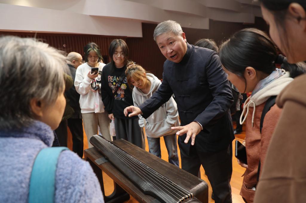 活动尾声,参会领导嘉宾与师生纷纷登台,近距离品鉴著名古琴“玉玲珑”的雅致风采。吴光同、吴明涛与大家围绕琴艺传承、文化感悟进行交流,并合影留念。