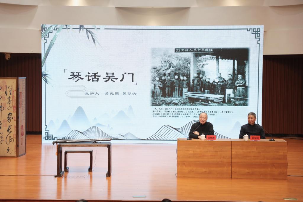 江科网讯(记者 刘莹)11月14日下午,吴门琴派主要代表人物、中国乐器协会古琴专业委员会顾问吴光同,著名古琴演奏家、吴门琴社社长吴明涛应邀走进我校,在求真音乐厅以“琴话吴门”为主题开展古琴文化专题讲座。江西省古琴学会会长海月、学校创办人于果,以及江西省古琴学会和社会各界古琴非遗文化传承爱好者等领导嘉宾出席讲座。宣传部部长耿卫平主持讲座。