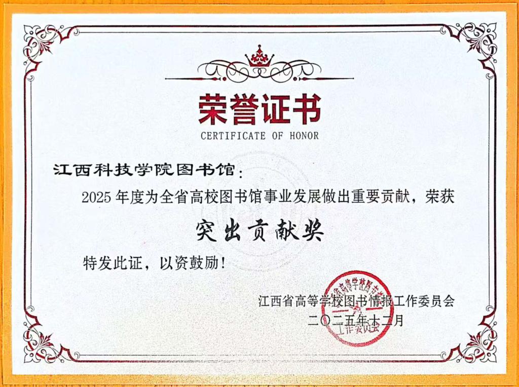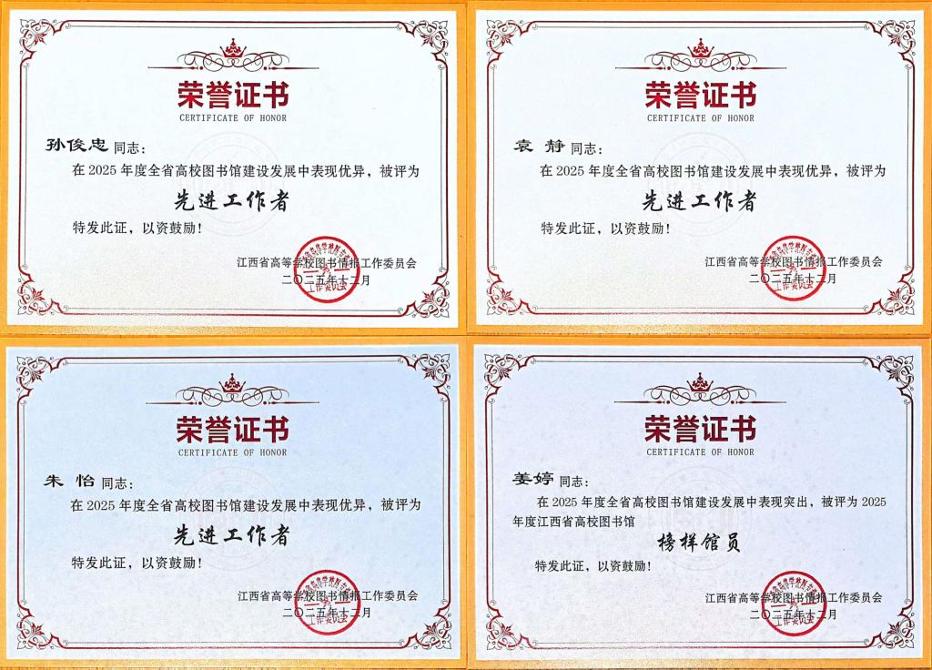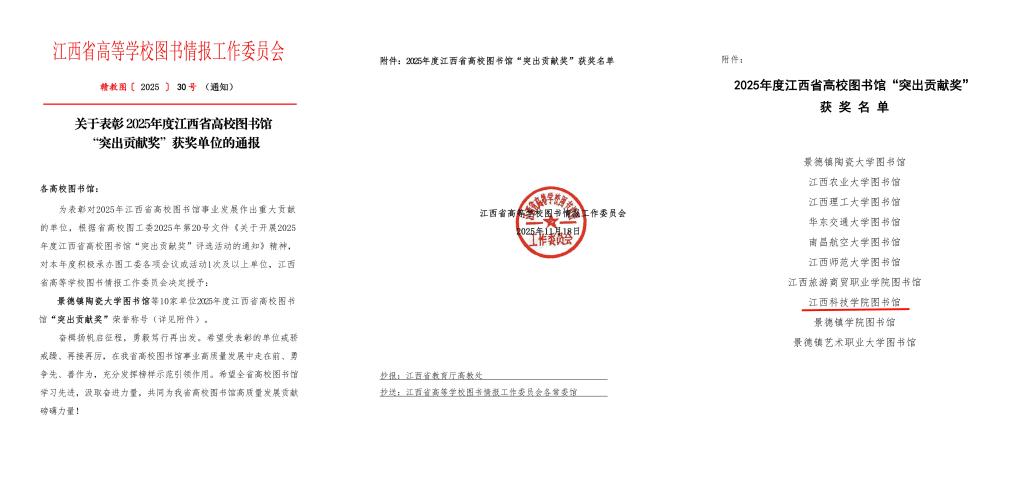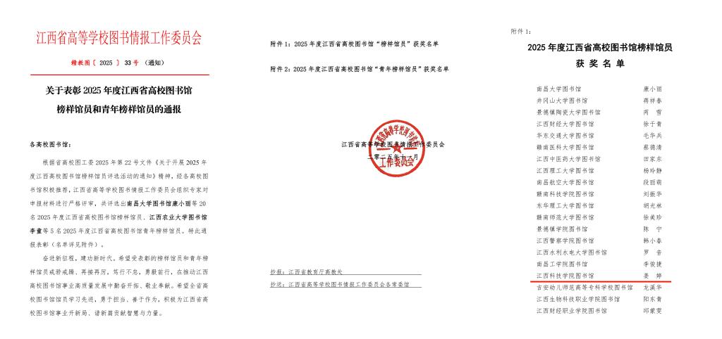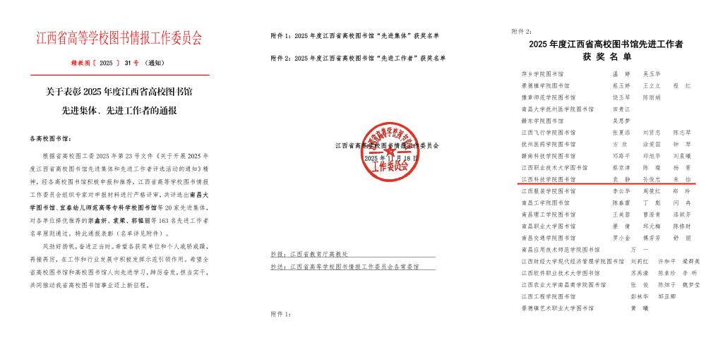 江科网讯(通讯员 舒向东 王利新)近日,江西省高等学校图书情报工作委员会(以下简称“图工委”)发布《关于表彰2025年度江西省高校图书馆“突出贡献奖”获奖单位的通报》《关于表彰2025年度江西省高校图书馆先进集体、先进工作者的通报》《关于表彰2025年度江西省高校图书馆榜样馆员和青年榜样馆员的通报》,我校图书馆荣获“突出贡献奖”,图文信息中心教师姜婷荣获“省高校图书馆榜样馆员”称号,袁静、孙俊忠、朱怡三位老师荣获“省高校图书馆先进工作者”称号。