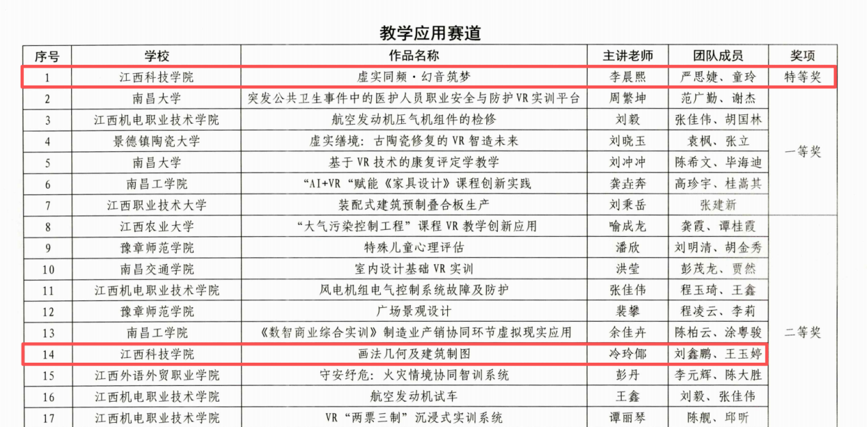 江科网讯(通讯员 管曾珍)近日,江西省虚拟现实教学应用创新大赛获奖结果揭晓,我校李晨熙老师主讲的《虚实同频·幻音筑梦》获教学应用赛道特等奖,冷玲倻老师主讲的《画法几何及建筑制图》获该赛道二等奖,学校荣获优秀组织奖。