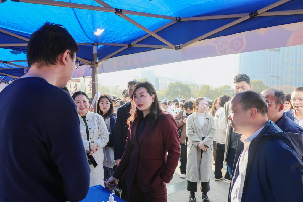 活动现场,张海涛校长一行先后走进各个展区,与参展学子们亲切交流。每到一处,张海涛校长都驻足察看摊位上的创意作品与展示成果,细致询问项目灵感来源、运营模式、专业融合亮点及未来发展规划。当得知不少作品是学子们结合专业所学自主研发设计,部分项目已实现小范围成果转化时,校长给予充分肯定,勉励同学们要始终保持创新热情,将课堂知识与实践需求紧密结合,在探索中锤炼本领、在实践中增长才干,让青春智慧在创新创业的浪潮中绽放光彩。