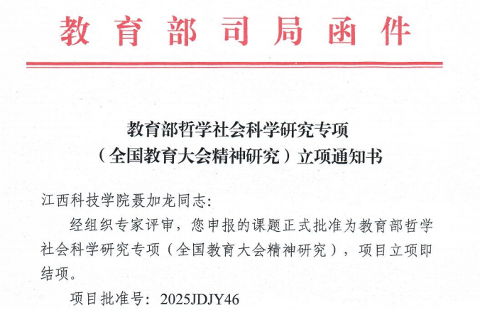 江科网讯(科研处)近日,教育部社会科学司下达了《教育部哲学社会科学研究专项(全国教育大会精神研究)》立项结果,我校习近平新时代中国特色社会主义思想研究中心聂加龙老师申报的项目获批立项。