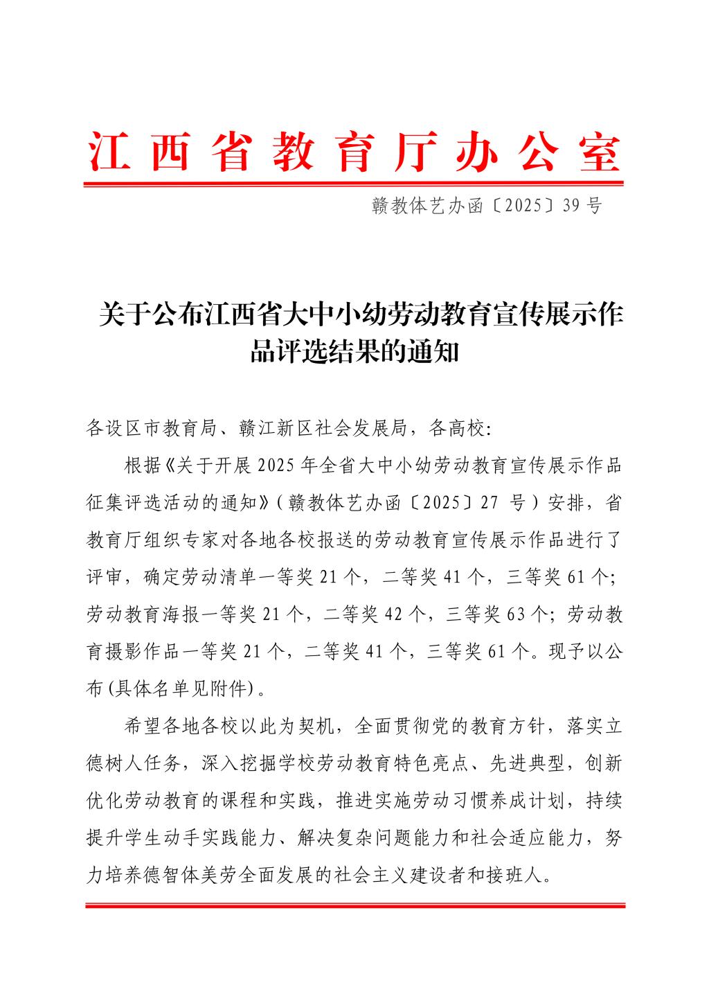 本次评选活动由省教育厅精心组织,旨在深入贯彻党的教育方针,落实立德树人根本任务,挖掘全省各级各类学校劳动教育特色亮点与先进典型。活动自启动以来,得到各地各校广泛响应,经过专家严格评审,最终确定劳动清单、劳动教育海报、劳动教育摄影三大类奖项。我校高度重视此次评选,积极整合优质教育资源,聚焦劳动教育与人才培养深度融合,报送的作品因主题鲜明、内涵丰富、创新性强获得评审专家一致认可。