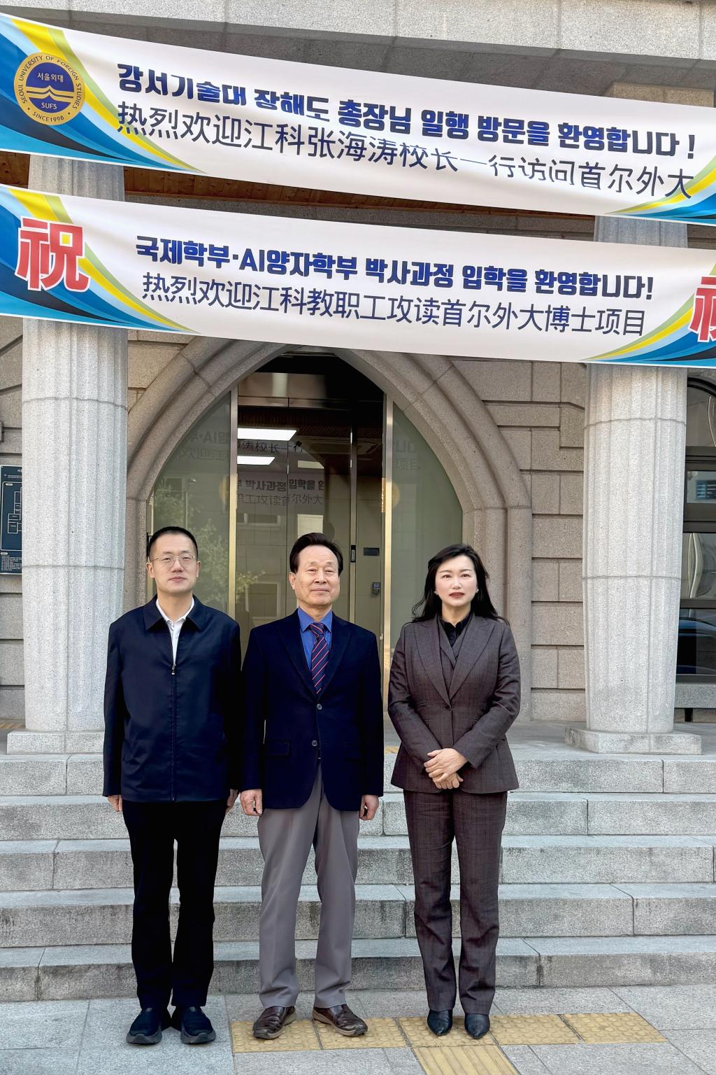 江科网讯(通讯员 王超 王玉琪 郭婉琦)1月6日,校长张海涛应邀访问韩国首尔外国语大学院大学(以下简称“首尔外大”),出席该校2026年度国际教学部与AI量子学部博士入学典礼,并与韩方就深化校际合作展开系列交流。首尔外大校长尹海水热情接待代表团一行。访问期间,双方聚焦跨学科高端人才培养、课程共建共享及科研协同创新等议题进行了富有成效的磋商,在多领域达成深化合作意向。副校长吕文威等参加此次活动。