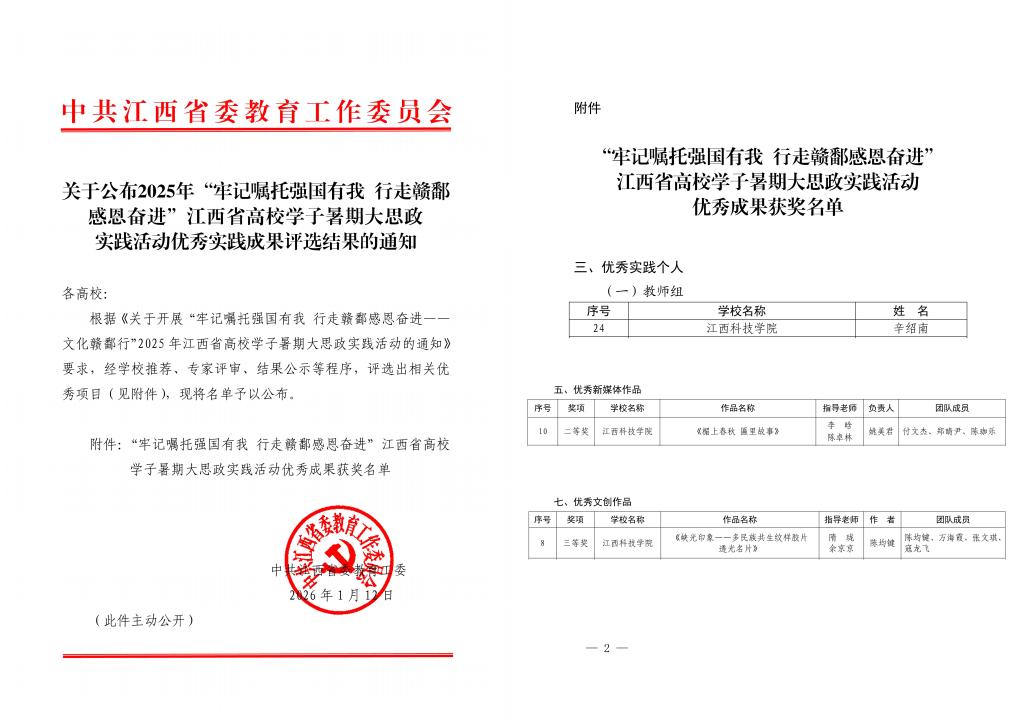 江科网讯(记者 何强江)近日,中共江西省委教育工委公布2025年“牢记嘱托强国有我 行走赣鄱感恩奋进”江西省高校学子暑期大思政实践活动优秀成果评选结果,我校马克思主义学院辛绍南老师荣获优秀实践个人,文化与传媒学院选送的《楣上春秋匾里故事》获优秀新媒体作品二等奖,招就处选送的《峡光印象——多民族共生纹样胶片透光名片》获优秀文创作品三等奖。