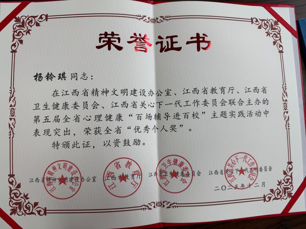江科网讯(记者 何强江)我校心理健康中心主任杨铃琪在江西省精神文明建设办公室、江西省教育厅、江西省卫生健康委员会、江西省关心下一代工作委员会联合主办的第五届全省心理健康“百场辅导进百校”主题实践活动中表现突出,荣获全省“优秀个人奖”。