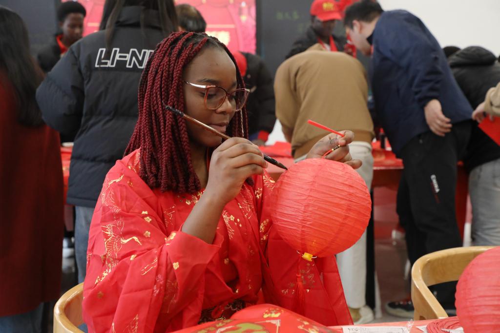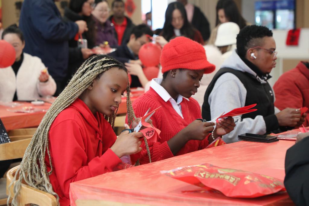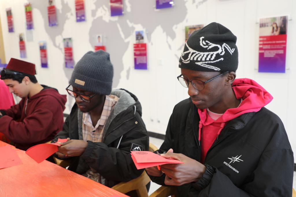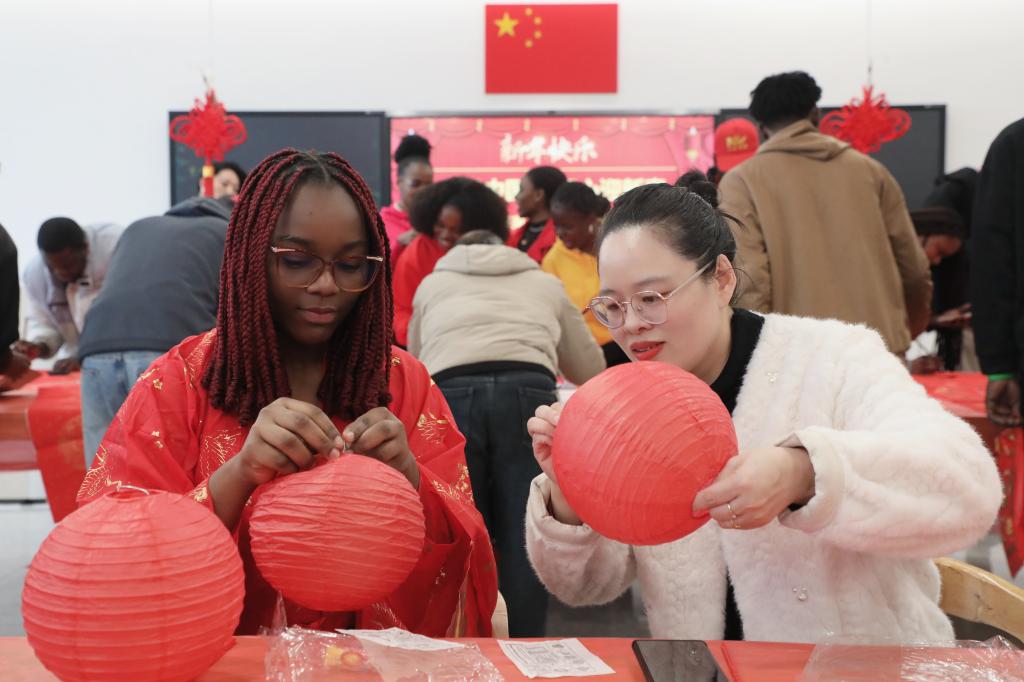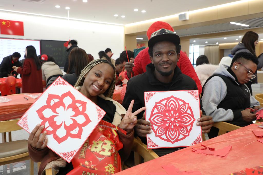 活动现场,来华留学生们通过视频短片了解春节的历史渊源与传统习俗,在老师的指导下学习并体验写春联、贴“福”、剪窗花、扎灯笼。“第一次穿汉服参加春节活动,裙摆飘逸的感觉太奇妙了!”来自摩洛哥的来华留学生甜欣轻轻抚摸着衣袖,眼中满是欢喜,“看着大家脸上的笑容,我真的走进了中国的新年故事里,一点都不觉得孤单。”科特迪瓦籍来华留学生梅若仪与同伴一同带来英文版《恭喜发财》。“这首歌的节奏特别有感染力,我跟着歌词学了很多吉祥话。”梅若仪笑着说,“在中国过年太热闹了,我希望把这份好运也分享给家乡的亲人。”“为了唱好这首歌,我练了一个月的中文发音。”来自喀麦隆的王秋雅坦言,“通过学唱这首歌,我知道了‘恭喜发财’‘万事如意’这些吉祥话的含义,也更懂中国人对新年的期盼,这是最特别的文化体验。”