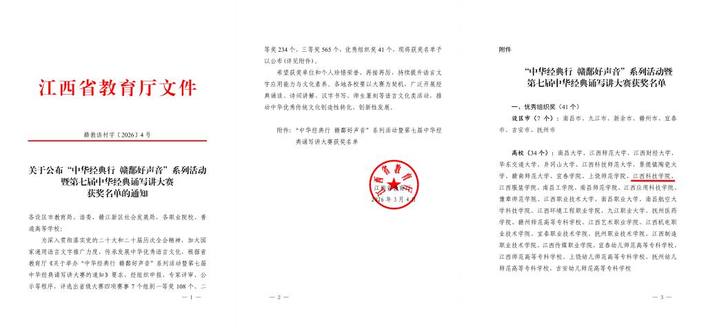江科网讯(记者 何强江)近日,江西省教育厅公布“中华经典行 赣鄱好声音”系列活动暨第七届中华经典诵写讲大赛获奖名单,我校师生凭借扎实的语言文字功底与深厚的文化素养,在诵读大赛、诗教中国、笔墨中国等赛事中斩获18项荣誉,学校连续第五年荣获优秀组织奖,再次彰显了在中华优秀传统文化传承与推广方面的突出成效。