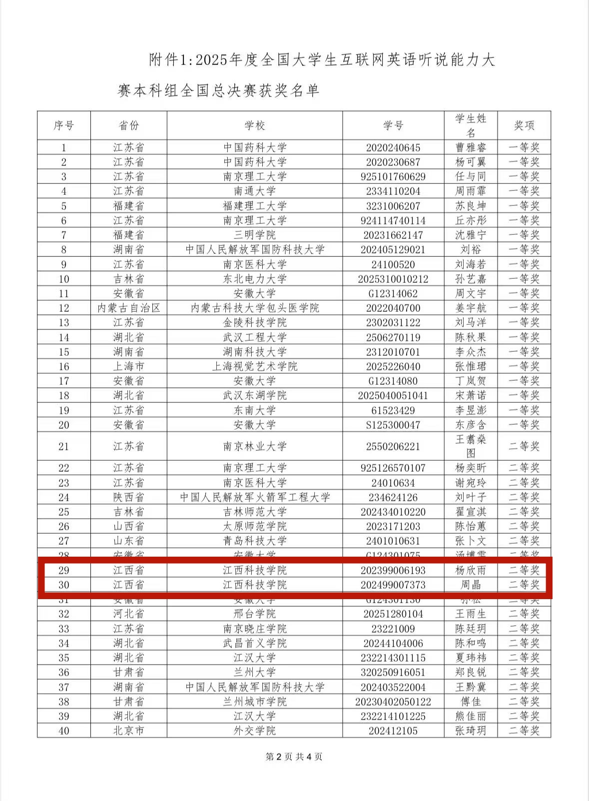 江科网讯(通讯员 郭龙艳)近日,2025年全国大学生互联网英语听说能力大赛全国总决赛圆满落幕,我校学子杨欣雨、周晶双双荣获全国二等奖,为学校赢得国家级荣誉,彰显了我校外语人才培养的扎实成效。
