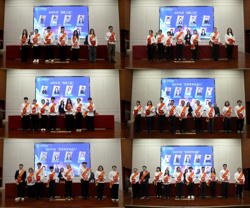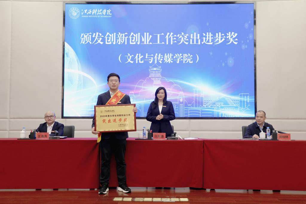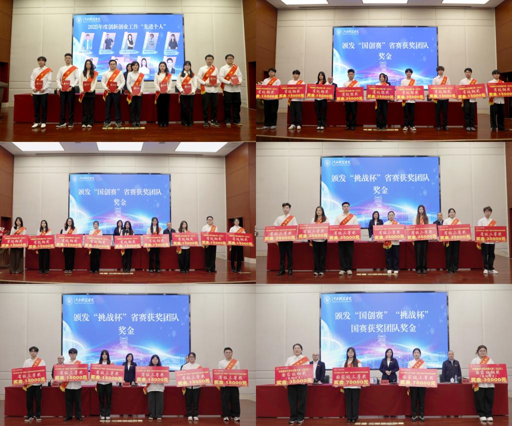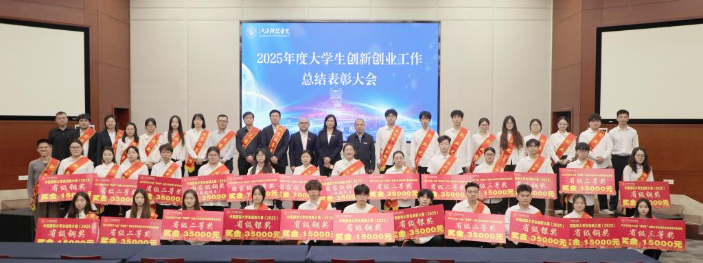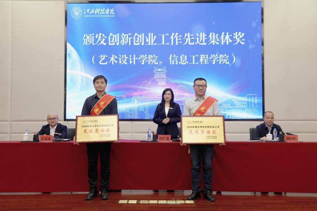 王涛涛副校长宣读《关于表彰江西科技学院2025年度大学生创新创业工作先进集体及个人的决定》,参会校领导为先进集体、先进个人及“挑战杯”“国创赛”获奖代表颁奖。
