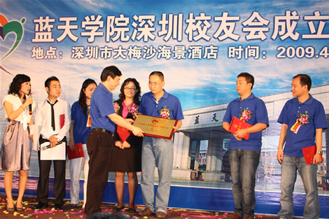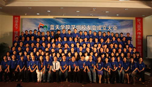 在成立大会上,于果会长作了重要讲话,他说,特别高兴来到鹏城和校友相聚。接着,于果对学院的现状和未来的发展规划作了简单介绍,希望广大校友继续秉承“自信、自强、创新、创业”的蓝天精神,再接再厉,在我国经济繁荣的华南腹地再创佳绩。对在场校友提出了三个“不论”要求,即校友之间不论身份、不论职位、不论金钱,因为我们都是“蓝天”的校友。最后,于果会长深情地说,希望校友们有空常回母校看看。
