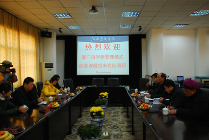 12月25日上午,厦门自学新管理模式探索课题组在我省自考办工作同志陪同下来我院调研,我院作为全国三所自考综合改革试点单位之一,前院长章启明教授,高等教育自学考试教育与教学研究所所长吴鹏教授、副所长刘永浪向课题组成员介绍了我院自考发展历程,解答了课题组成员提问,并陪同参观了我院教育教学实训基地。
