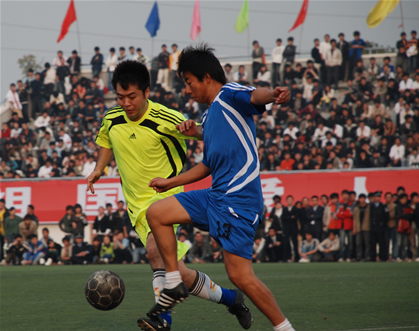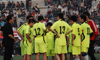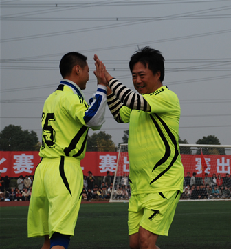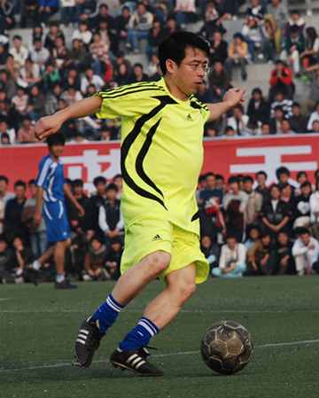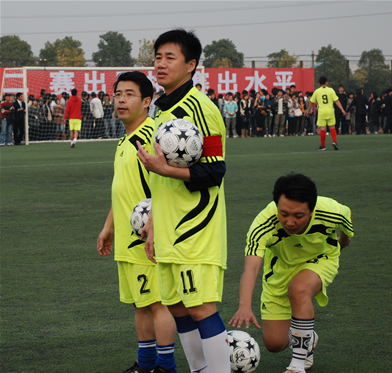 比赛一开始,双方门前均险象环生,队员逼抢积极,蓝天学院队不知是光顾看明星忘了踢球还是想先礼后兵,开赛不到半分钟,东方时空队就进了一球,领先一分,这时,我院足球队队长体育系副主任李康好像意识到了情况不妙,立即调动起队员的积极性,他的“指点江山”立即引起了下场解说的博林老师的注意:蓝天学院踢得很认真,领队在布阵了!几分钟后,江西蓝天学院队也进了一球,博林老师笑说:怎么我一下来就不行了,看来离开了我还是不行……