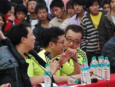 下半场,东方时空队明显表现体力不支,博林老师笑说:阿丘怎么搞的,明显腿脚缺钙,难道真地应验了那句“要赢不赢头盘”?朱轶立即接过话说:看来博林老师打麻将打多了,麻将不赢头把!我们踢球就时兴赢头球,结果,雪村也在一旁帮腔,解说员们将平时的幽默风趣带到了现场,而阿丘、张腾岳、朱轶成了解说员们调侃的对象,引得全场笑声不断,掌声连连。
