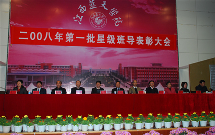 12月3日下午,在瑶湖学术报告厅A厅,我院隆重举行2008年第一批星级班导表彰大会,59名五星级和94名四星级班导受到表彰,大会对第一批星级班导评选情况作了说明并对下一次评选工作提出了要求。于果董事长,党委书记郑守华,院长王志锋,学院顾问章启明,副院长汪茂湘、吴吉平、许祥云、章新蕾、林素君、焦扣云、周万华、胡剑锋出席了大会,参加会议的还有党办、工会、人事处、财务处、党团办、学工处、教务处、部办、系主任以及全体班导500余人,会议由副院长胡剑锋主持。