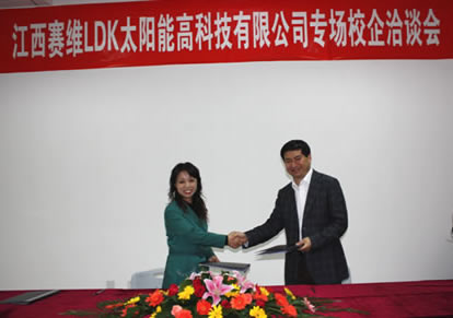 江西赛维LDK太阳能高科技有限公司是目前亚洲最大的太阳能多晶硅片生产企业,根据此次与赛维公司签订的协议,公司每年将接收我院600名毕业生就业。通过与赛维的合作,学院了解到公司对人才的要求,更有针对性地培养社会需要应用型人才,更好地提升学生的竞争力;企业同时可储备一批高素质的生产技术骨干;学生在严峻的就业形势下,解决就业难题。从而实现学校、企业、学生“三赢”。这也是我院为适应产业的发展需要,为地方经济服务、为江西建设提供人力资源支持。是我院在新的经济形势下,为促进毕业生更好的就业,加强与企业的合作,积极开辟的就业渠道。