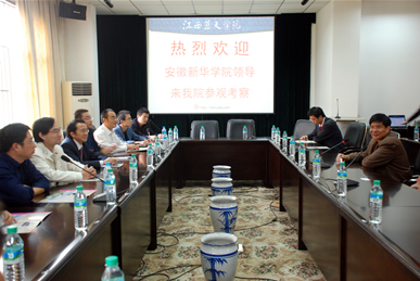 10月13日,安徽新华学院行政采购中心副总经理袁种宝、基建办主任程润、江西新华电脑学院院长吴严坤一行来我院参观考察,我院副院长许祥云亲切接见。