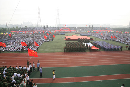 我院2008级新生军训检阅暨开学典礼,9月16日上午,在院奥林匹克体育中心隆重举行。这是一场内容多、规模大、高质量的军训检阅和开学典礼。由以往的京东、瑶湖两校区各自进行军训检阅和开学典礼,演4场,浓缩成今年的1场。新、老校区万名新生斗志昂扬、步伐整齐地步行到院奥林匹克体育中心,接受省相关单位领导及院领导的军训检阅,观看文艺汇演。