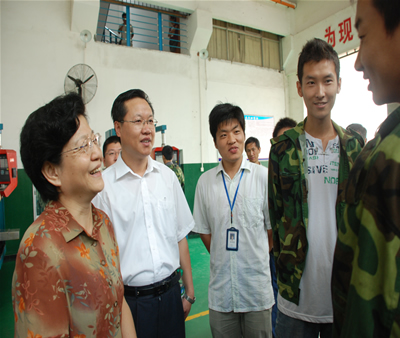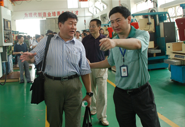 安焕晓(左一)一行在参观我院数控实训中心时,与几个正在实训的山西籍学生亲切交谈,并对他们说:“蓝天学院不错,能学到很多东西,你们要认真学习”