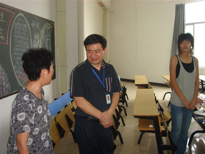 9月8日,是我院自考新生正式上课的第一天,同学们在两周的军训期间,表现出了“流血流汗不流泪,掉皮掉肉不掉队”的美好风尚,整体的精神面貌明显好转,为了让这种精神继续带入学习中,提高教育教学质量,这天上午,于果董事长、院党委书记郑守华、院长王志锋为首,组成三个小组,分别在京东、瑶湖两校区,巡视2008自考新生在“蓝天”的第一堂课教学。