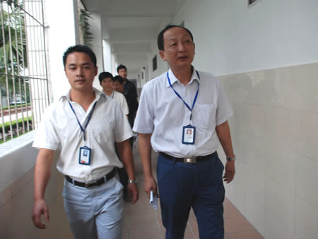 王志锋在京东校区巡视教学时,询问班导关于学生的报到情况(晏玉荣/摄)