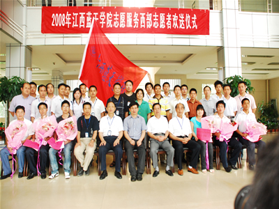 2008年我院服务西部志愿者名单:瑶湖校区:计算机系05计算机应用(2)班丁一科、机械系数控(14)班杨欣、经管系05人力(2)班许章城,京东校区:商贸系05法律三(1)班李红印、数控系数控三(3)班吴振林、经管系05工商四(8)班陆赛男。其中丁一科、李红印、杨欣、吴振林四位同学入选为2008年全国大学生志愿服务西部计划志愿者。陆赛男、许章城入选为2008年江西省开发性金融志愿者。
