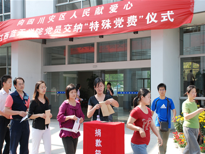 根据中组部下发的《关于做好部分党员交纳“特殊党费”用于支援抗震救灾工作的通知》的文件精神,5月21日下午,在行政楼一楼,章启明、郑守华、周万华等党员领导和700多名党员在党委的组织安排下,怀揣着对四川灾区人的关爱,纷纷从两校区赶来,交纳“特殊党费”支援灾区人民群众,共收到89709.7元,部分党员交纳了一个月工资作为“特殊党费”。