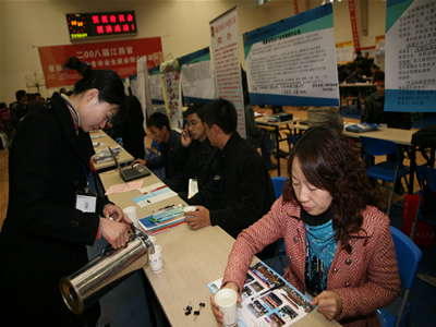 为了让企业了解学校,许多参会的学校背来了大包大捆印刷精美的毕业生信息介绍和毕业生就业专刊,再由学校工作人员发给一个个企业摊位。江西财经职业学院编印的资料,更是把600多毕业生的照片、联系方式等资料全都刊出,还冠以“优秀毕业生”的头衔,记者在赞叹该校就业工作做得细致的同时,还想到另一个问题:毕业生其实就是学校的“产品”!