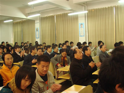 在汇报会上,汪立夏首先介绍了专家组此行的目的,他说,这次来,主要是对蓝天学院的思政课的教育教学情况进行评估,促进十七大精神进课本,并希望通过这次评估,能使蓝天学院的思想政治理论教学更上一个新台阶。