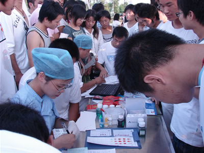 在现场,记者看到同学们排着长长的队伍踊跃参加无偿献血活动,在献血登记簿上,一天下来已经有三百多个同学献了血。据悉,江西蓝天学院登记注册献血的学生到现在为止已有一万多名了。