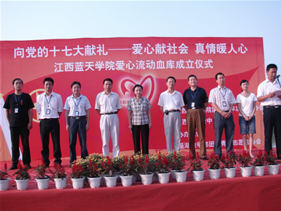 9月27日下午,由我院团委青年志愿者协会、江西省血液中心主办,瑶湖教学部团委青年志愿者协会协办,在临水广场举行了“向党的十七大献礼——爱心献社会,真情暖人心江西蓝天学院爱心流动血库成立仪式”。出席成立仪式的我院领导有副院长兼党委副书记周万华、党办主任兼统战部部长郭安海、宣传部部长陈庆省、组织部部长邓国金、院团委书记周小丰,省血液中心领导彭继红主任出席了仪式。