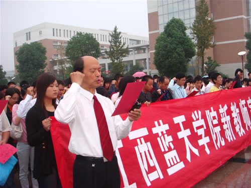 为隆重庆祝第二十三个教师节,进一步激发全体教师献身教育、热爱学生的思想感情,创设良好的师德师风活动载体,我院院工会在教师节之日,组织全体新教师开展了这次教师宣誓活动。