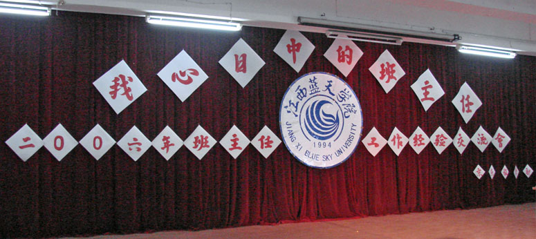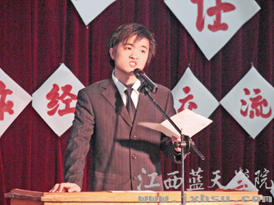 2006年12月27日下午,江西蓝天学院京东校区以《我心目中的班主任》为主题,召开了2006年班主任工作经验交流会。会议由京东校区党总支书记、党团办公室主任杨琥教授主持,副院长吴吉平,京东校区各系、部负责人,班主任和学生代表共计一千余人参加了会议。